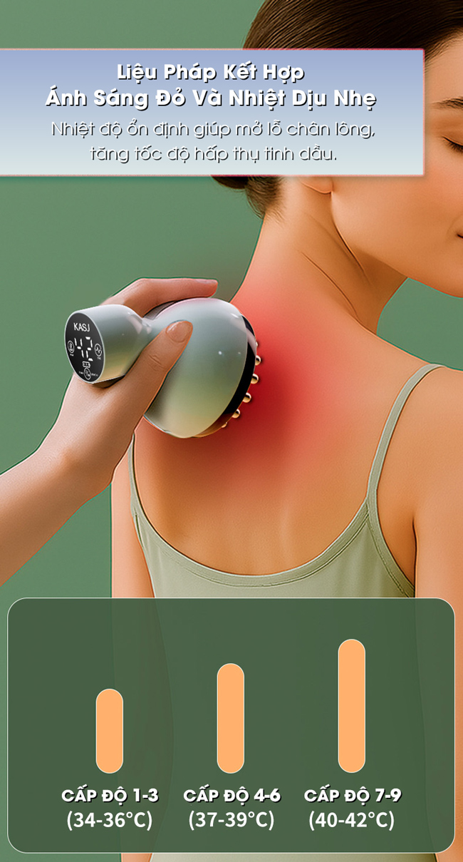 - Nhiệt trị liệu + Ánh sáng đỏ - Bộ đôi phục hồi mạnh mẽ: KASJ L6 được trang bị 9 mức nhiệt ổn định kết hợp đèn ánh sáng đỏ: