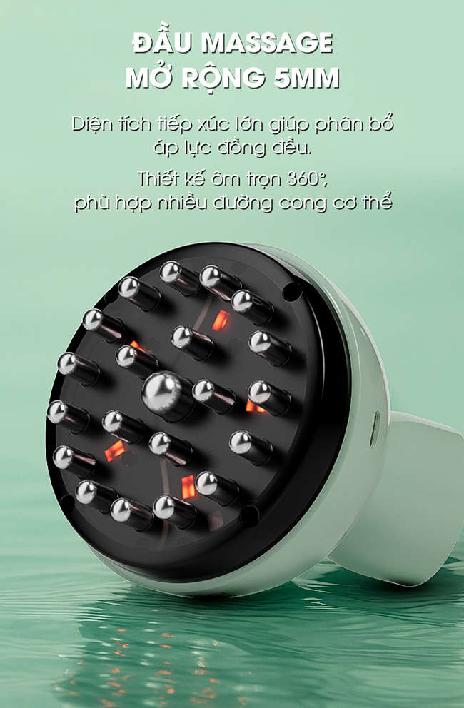- 21 đầu massage tiếp xúc rộng: Tăng diện tích tiếp xúc để phân bổ lực đồng đều. Giảm ma sát khi cạo gió, tránh tạo vệt đỏ đậm như phương pháp truyền thống. Phù hợp cho các vùng lớn như lưng, vai, đùi mà vẫn đảm bảo an toàn.