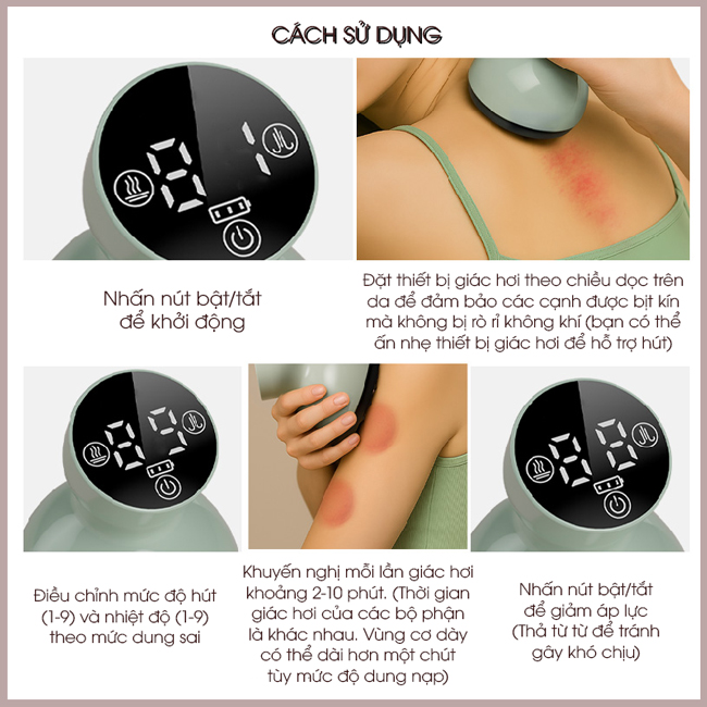 - Bắt đầu ở cường độ thấp và điều chỉnh cho thoải mái. Mức 1-3 để cạo, mức 3-5 để giác hơi.