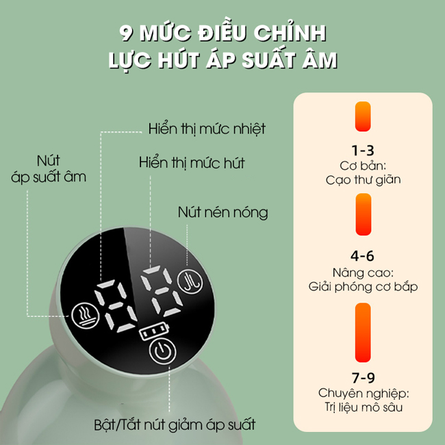 + 9 cấp độ lực hút áp suất âm phù hợp với nhiều cơ địa.