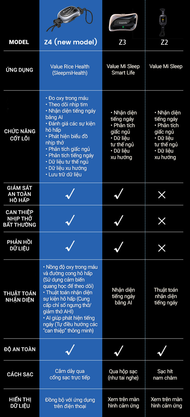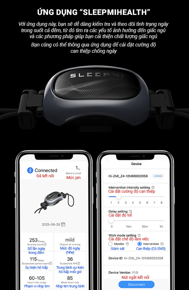 Sleepmi Z4 là thiết bị hỗ trợ giấc ngủ thông minh kết hợp AI + EMS + theo dõi sức khỏe, giúp phát hiện dấu hiệu ngáy và hỗ trợ điều chỉnh nhịp thở một cách nhẹ nhàng mà không làm bạn tỉnh giấc, từ đó giảm ngáy và cải thiện chất lượng giấc ngủ một cách tự nhiên, an toàn và tiện lợi.