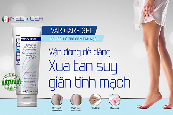 Gel Medicosh Varicare hỗ trợ điều trị suy giãn tĩnh mạch hiệu quả, làm thuyên giảm các cảm giảm khó chịu đau nhức cho suy giãn tĩnh mạch gây ra, đồng thời giúp nuôi dưỡng làn da,mang lại cảm giác dễ chịu cho người sử dụng.