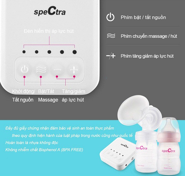 - Máy hút sữa Spectra Q có thiết kế độc đáo khi tự động tắt sau 30 phút sử dụng để đảm bảo an toàn cho mẹ.
